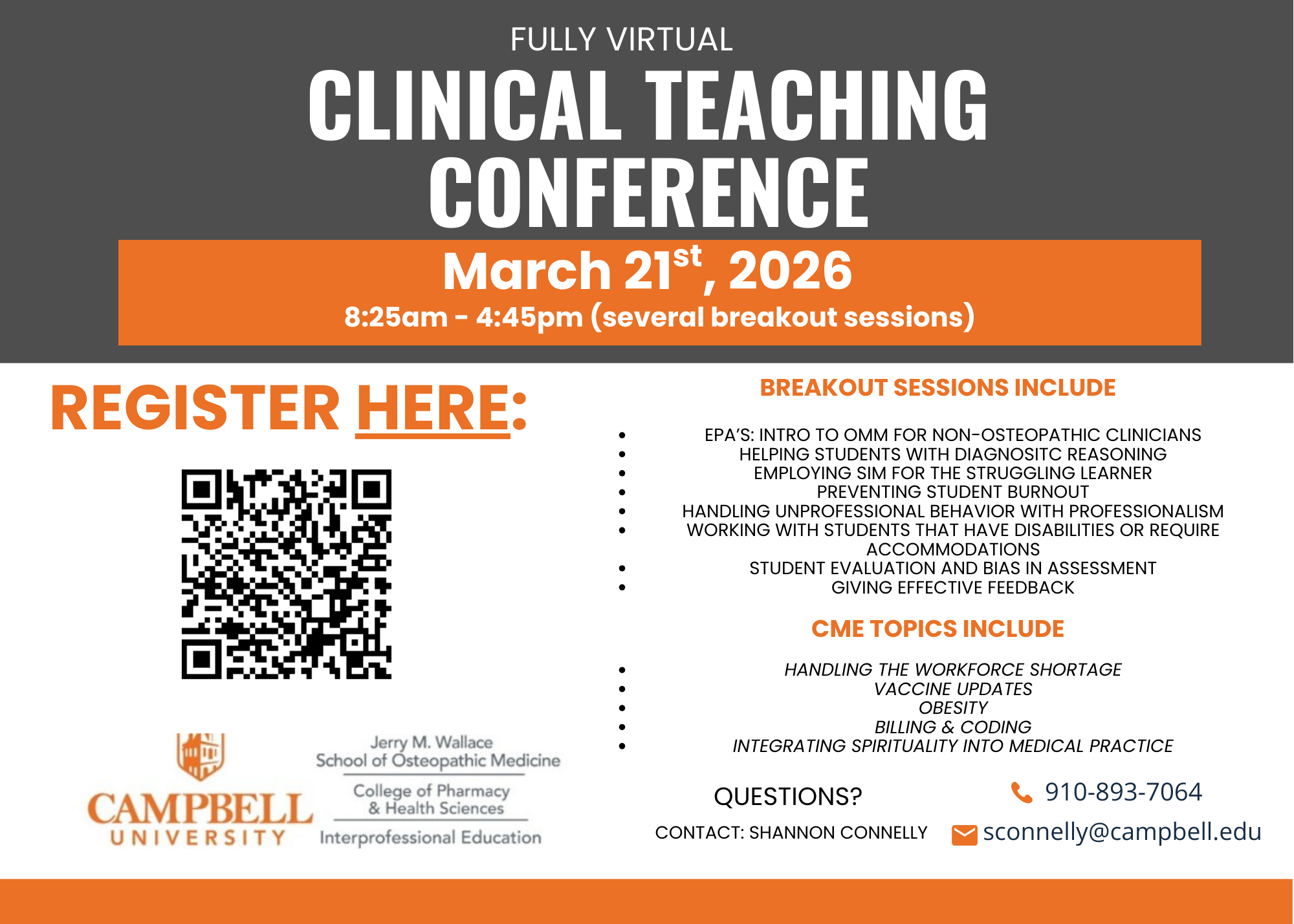 Each year, CUSOM collaborates with the Campbell University College of Pharmacy & Health Sciences (CPHS) to host an interprofessional Clinical Teaching Conference that brings together faculty physicians, pharmacists, PAs, Nurses, and other allied health professionals from our regional network to share strategies, strengthen clinical education, and foster community engagement. We welcome proposals for CME activities and are available to consult on program development tailored to specific site needs or educational goals.